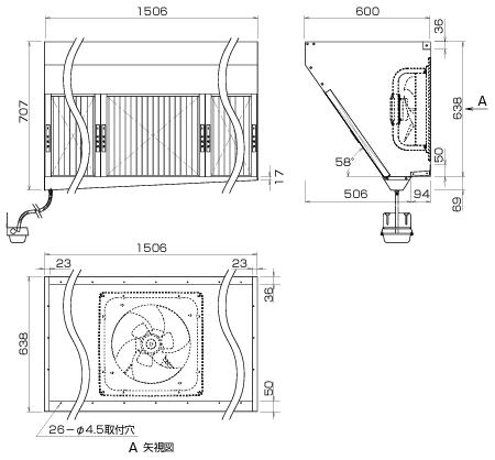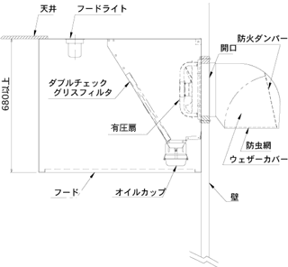 - 低静圧ダブルチェックLL型グリスフィルタ使用のため圧力扇を従来より小さくすることにより低騒音が実現しました。